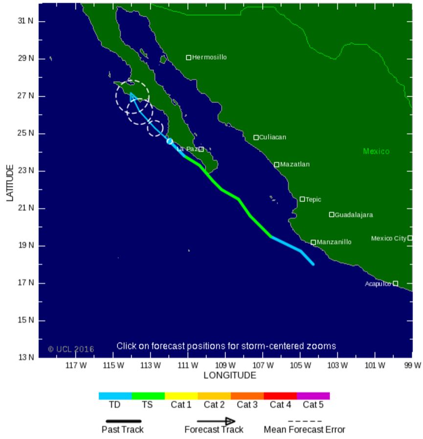 08/08 : la tempête tropicale 11E s'est renforcée et a atteint le stade de tempête tropicale et à été baptisée Javier. Le système continu vers le Nord-Ouest et s'apprête à toucher la péninsule de Basse Californie et génère des vents soufflant à 110 km/h et de très fortes pluies.