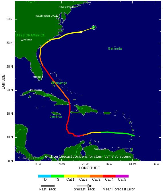 Matthew va poursuivre une trajectoire WSW avant de bifurquer à l'ouest puis brutalement vers le nord-ouest d'ici dimanche. Il se dirigera alors vers la Jamaïque, l'extrême ouest d'Haïti puis Cuba et les Bahamas en début de semaine prochaine. Le potentiel destructeur de cet ouragan est extrêmement important pour toutes ces îles.