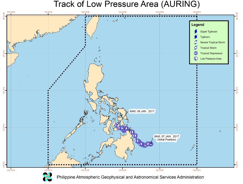La tempête tropicale Auring s'est formée au large des côtes Sud-Est des Philippines et va traverser le Sud et le centre Sud de l'archipel durant les 72 prochaines heures. Auring qui adopte un cap plein au Nord-Ouest génère des vents soufflant à 100 km/h ainsi que de très fortes pluies capables de causer des inondations et des glissements de terrain.