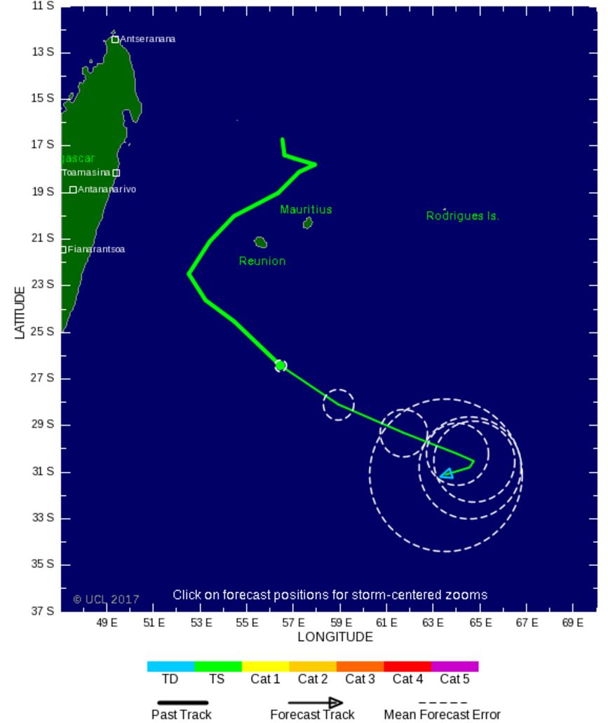 La trajectoire prévue demeure très menaçante, puisque concernant potentiellement directement La Réunion, avec un passage à proximité immédiate du département, ou directement sur l'île, prévu pour la journée de mardi (7 février). Mais il demeure une marge d'incertitude encore non négligeable sur cette prévision, ce qui n'est pas anodin dans le cas de figure présent, car un décalage de la trajectoire réelle, ne serait ce que de quelques dizaines de kilomètres, pourrait tout changer en termes d'influence et de conséquences pour l'île. Cela est dû à la structure particulière du phénomène, à la fois très dissymétrique et se caractérisant par un coeur de vents forts de dimension extrêmement réduite (moins de 100 km de diamètre pour la zone de vents supérieurs à 70 km/h). La trajectoire la plus défavorable serait évidemment une trajectoire qui ferait passer le centre du météore directement sur l'île (scénario tout à fait envisageable à l'heure qu'il est), ou légèrement au nord. Mais une trajectoire qui ferait passer le centre du météore à ne serait-ce que 80 km au sud de La Réunion, résulterait en une influence minime pour l'île, que ce soit en termes de vents ou de pluies. Mais ce dernier scénario n'est toutefois pas celui actuellement privilégié.