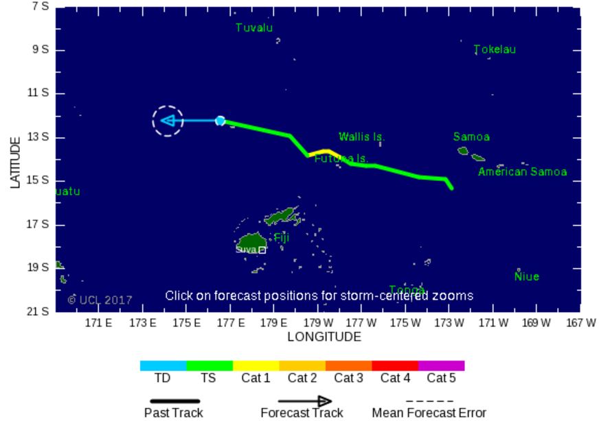 12/05 : À 12 heures (2 heures du matin à Paris), la dépression se trouvait à 125km à l'Est de Futuna. Elle se déplace vers l'ouest à environ 15km/h. "Près de son centre, elle génère des vents estimés à 90km/h, avec des rafales à 130km/h", assure le prévisionniste. La dépression devrait atteindre les côtes de l'île dans la soirée et se renforcer avec des vents proches de 50km/h avec des rafales à 140km/h.