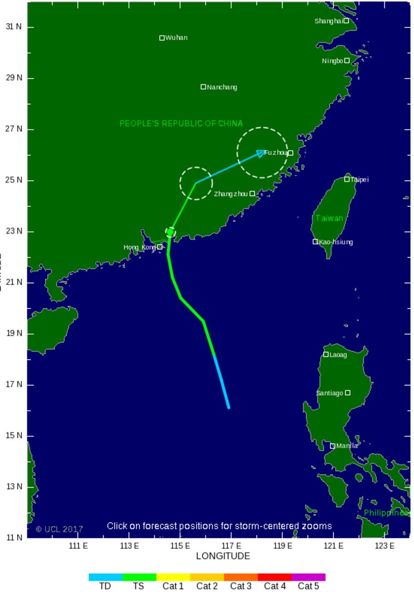 Selon le CMN, le typhon devrait se déplacer vers le nord-ouest à une vitesse de 20 km/h vers le Guangdong et toucher terre sur la côte, entre Zhuhai et Shantou, lundi dans la nuit.