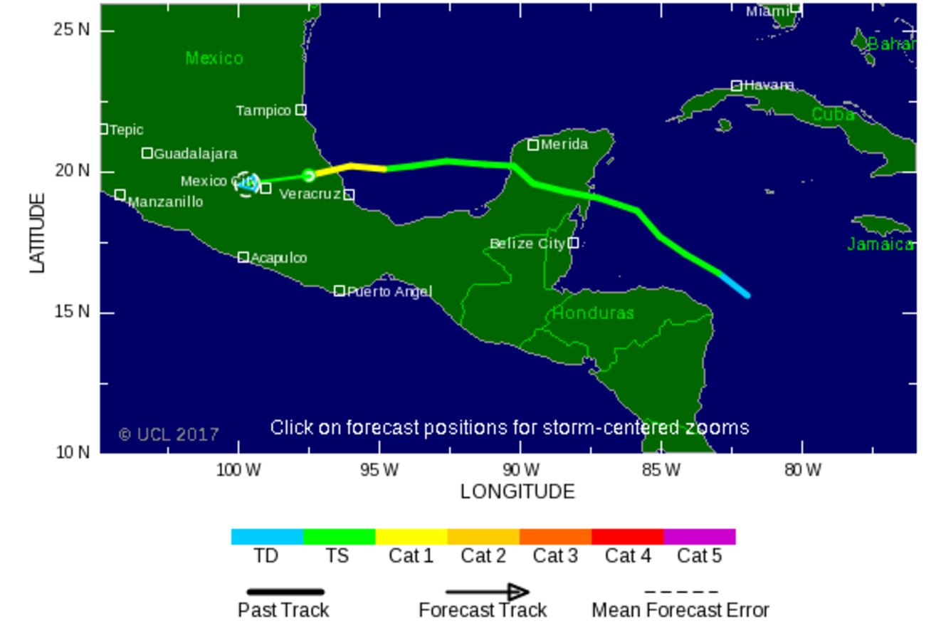 En progressant dans l'intérieur des terres des États mexicains de Veracruz, Puebla, Tlaxcala ou Hidalgo, tout en se heurtant à un relief très escarpé, les restes de l'ouragan devraient apporter aujourd'hui de très fortes précipitations (localement plus de 200 mm). De fortes pluies pourraient aussi arroser la capitale, Mexico, où l'équivalent d'un mois de précipitations est attendu en 24 heures aujourd'hui (près de 70 mm).