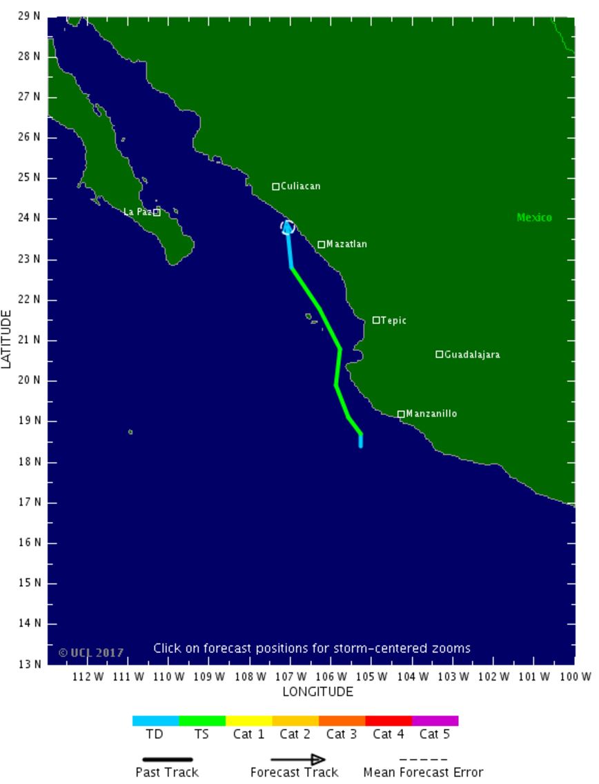 La tempête tropicale Pilar s'est formée au large des côtes Ouest du Mexique à la hauteur de Manzanillo et longe le littoral en générant des vents soufflant à 90 km/h et de fortes pluies. Le système ne devrait pas se renforcer et devrait toucher terre sous la forme d'une dépression tropicale dans le Nord Ouest du pays.