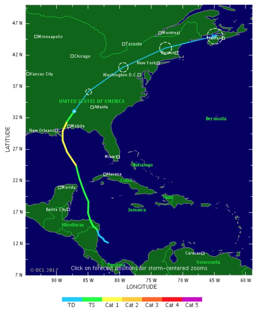 Par la suite Nate va continuer à remonter en latitude vers le Golfe du Mexique en se renforçant et devrait s'intensifier en ouragan de catégorie 1 (vents soufflant à 145 km/h) le 08 octobre prochain. A cette échéance le système devrait adopter un cap au Nord-Est pour toucher les côtes de l'Alabama et de l'Ouest de la Floride le 09 octobre.