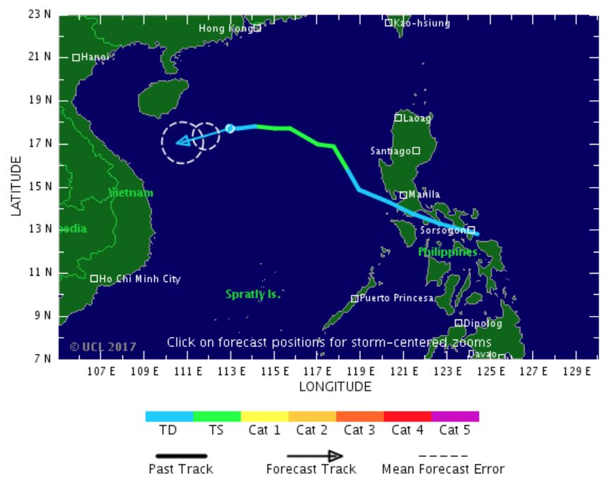 La dépression tropicale 30 s'est formée sur le centre nord des Philippines et fait route au Nord Ouest. Pour l'instant le système génère de très fortes pluies et des vents à 50 km/h. Dans les prochaines heure, la dépression va retrouver les eaux chaudes de la mer des Philippines et va ainsi pouvoir gagner en puissance et devenir une tempête tropicale.