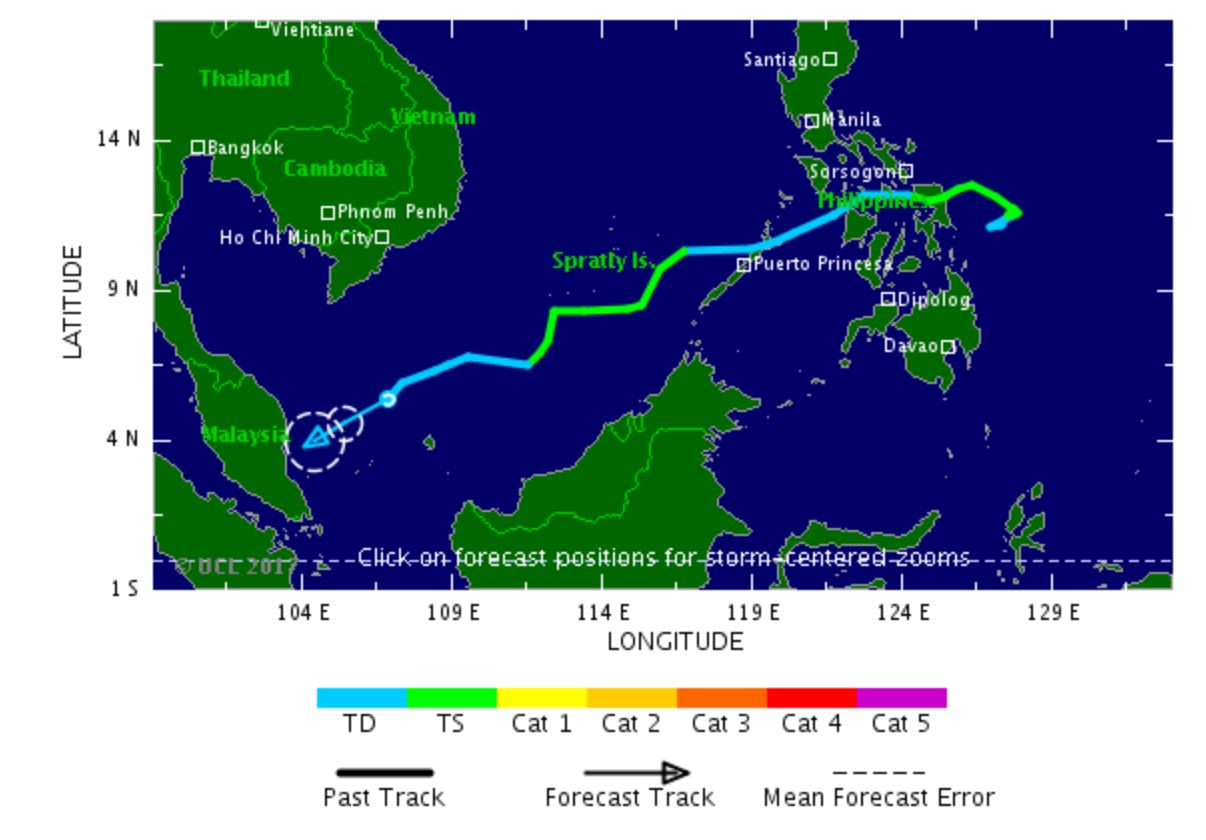 19/12 : la tempête tropicale Kai-Tak a traversé le centre des philippines ce week-end et a retrouvé les eaux chaudes de la mer des Philippines ce qui lui a permis de ce réactiver. Le système fait route au Sud-Ouest et devrait atteindre l'est de la Malaisie le 23 décembre sous la forme d'une faible tempête tropicale ou d'une dépression tropicale. Dans tous les cas, Kai-Tak devrait produire des vents soutenus et surtout de très fortes pluies susceptibles de causer des inondations et des glissements de terrain.