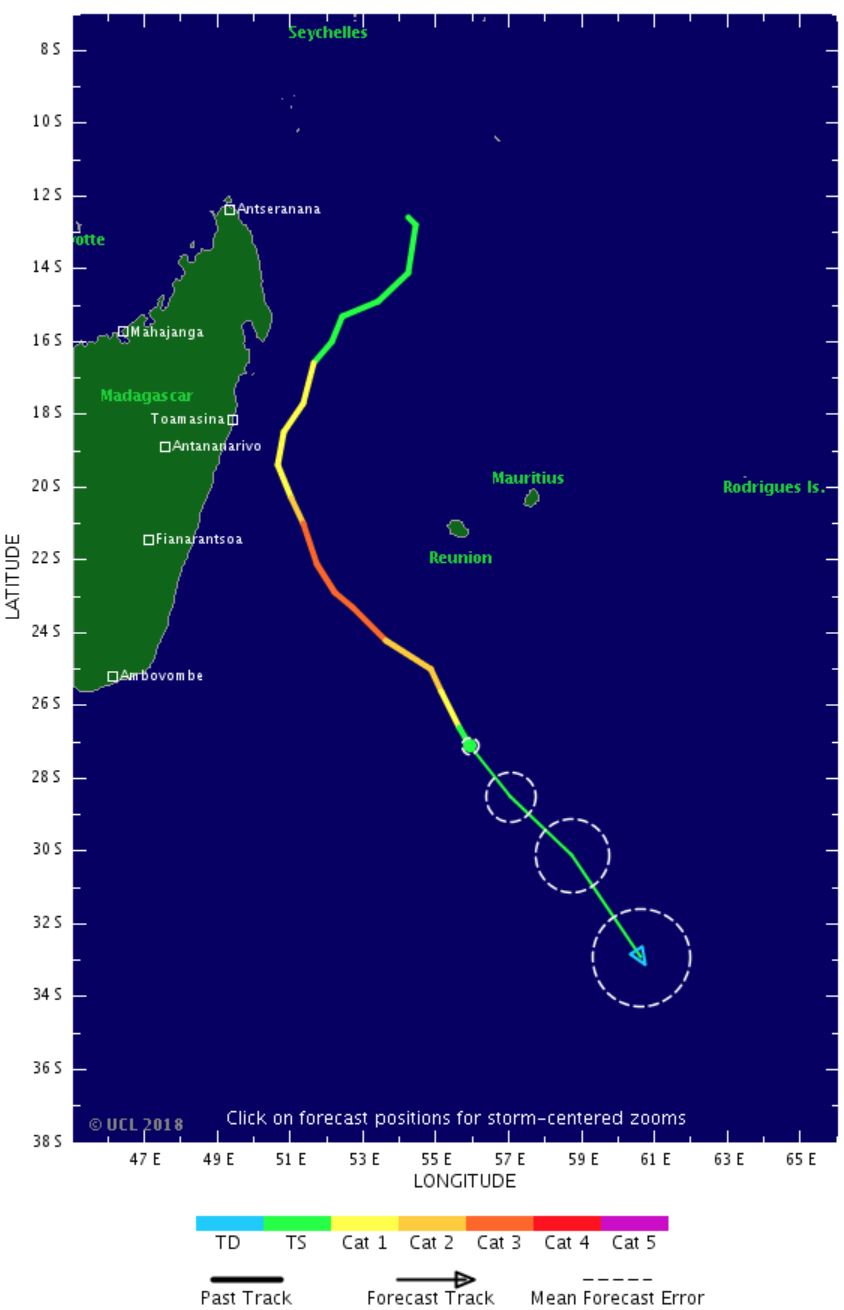 Le météore est prévu suivre une trajectoire courbe entre Madagascar et les Mascareignes, le faisant ainsi transiter à l'ouest, puis au sud-ouest de La Réunion ce lundi, mais avec le centre du cyclone demeurant bien au large de nos côtes (400-500 km). La partie centrale du phénomène ne concernera donc pas La Réunion. Ce qui signifie que le risque de voir des conditions de vents cycloniques affecter le département est désormais considéré comme écarté.