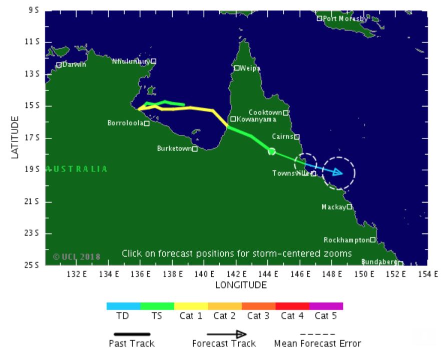 Le cyclone se trouve actuellement à 170 km au sud-est de Groote Eylandt et à 220 km au nord-est de Borroloola et se déplace vers l'ouest à 12 km / h.