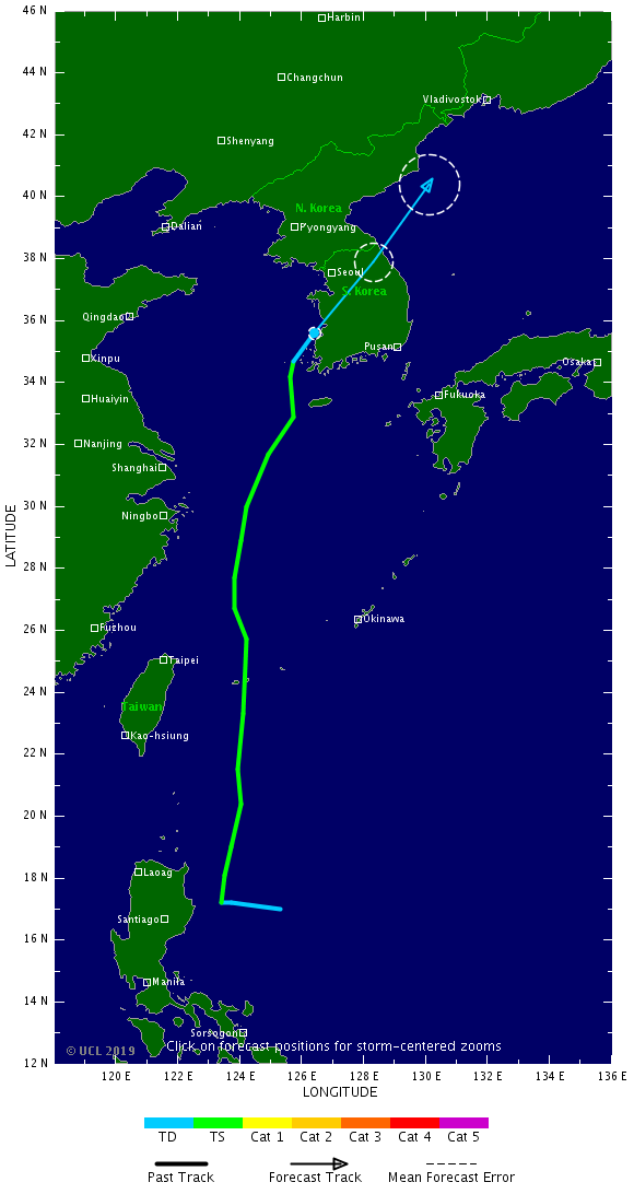 Une dorsale subtropicale entraine un déplacement orienté globalement vers l'Ouest dans un premier temps, ce qui devrait rapprocher DANAS des Philippines. Toutefois, le scénario privilégié actuellement est que le phénomène contourne cette dorsale et remonte alors vers le Nord, ce qui permettrait d'éviter un atterrissage sur l'île de Luçon. Ce changement de cap conduirait le système en direction de Taïwan.
