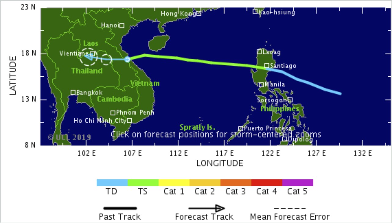 La traversée de l'archipel s'annonce rapide d'après les modèles de prévision numérique. Le système sera déjà en mer de Chine méridionale mercredi matin. À partir de là, une nouvelle phase d'intensification est suggérée pendant que le système se dirigera en direction de l'île chinoise de Haïnan et des côtes Est du Vietnam. Selon les dernières prévisions, il n'est pas exclu que le stade minimal de forte tempête soit atteint d'ici les prochaines 72h.