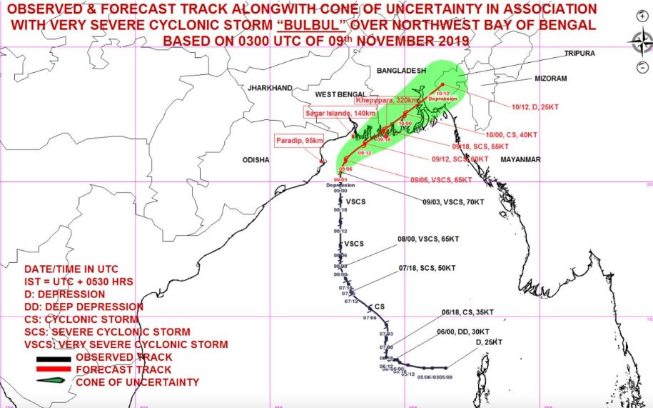 À 06 UTC, le cyclone tropical Bulbul qui évolue dans le Golfe du Bengale était situé à 95 Km à l'Est Nord-Est de Paradip (Nord-Ouest Inde). Le système se dirige en direction du Nord à environ 15 km/h et se rapproche des côtes du Bengale occidental. Bulbul est un dangereux cyclone qui génère des rafales de l'ordre de 90 kt (166 km/h) selon le JTWC. Le système est prévu légèrement s'affaiblir avant de toucher terre entre les îles Sagar et Khepupara en fin de journée ou dans la nuit. Malgré cet affaiblissement, Bulbul pourrait être encore une forte tempête tropicale au moment de l'impact, générant potentiellement des conditions cycloniques dans les régions traversées par le coeur du phénomène.