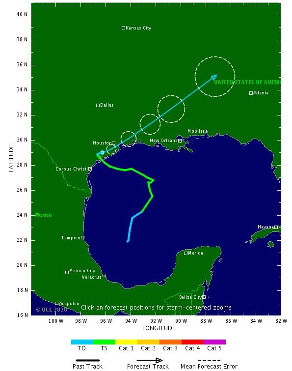 La trajectoire des prévisions du NHC emmène Beta vers la côte du Texas, avec un atterrissage prévu lundi ou lundi soir. La tempête devrait alors rester près de la côte sud-est du Texas mardi.