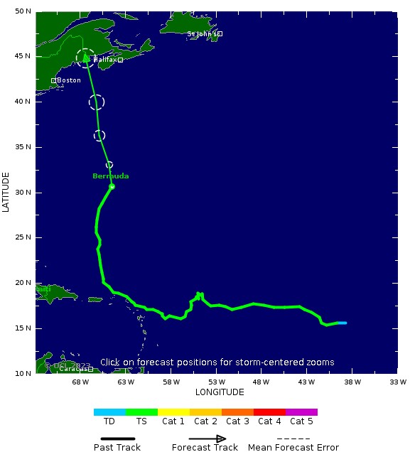 La tempête devrait continuer sur une trajectoire vers le nord tout au long de la semaine, maintenant une force de tempête tropicale modérée à forte alors qu’elle passe près ou juste à l’est des Bermudes vendredi soir puis se diriger bers l'extrême Nord-Est des USA et l'Est du Cabana.
