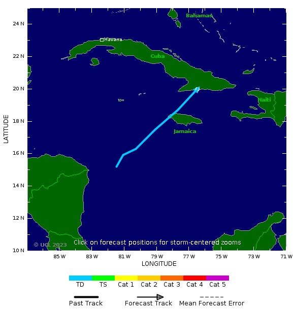 La perturbation se trouvait au-dessus du centre-ouest des Caraïbes à environ 450 km à l’ouest-sud-ouest de Kingston, en Jamaïque, avec des vents de 63 km/h, .