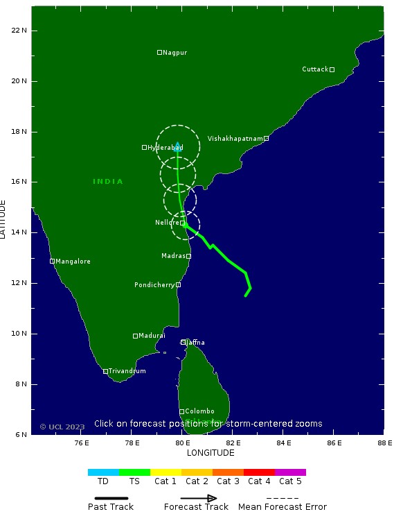Il est ensuite prévu qu’il se déplace presque vers le nord, parallèlement de près à la côte sud de l’Andhra Pradesh, et devrait traverser la côte sud de l’Andhra Pradesh entre Nellore et Machilipatnam le matin du 5 décembre sous la forme d’une tempête cyclonique. À l’heure actuelle, on s’attend à ce qu’il atteigne des vitesses de vent soutenues maximales de 80 à 90 km/h, avec des rafales à 100 km/h.