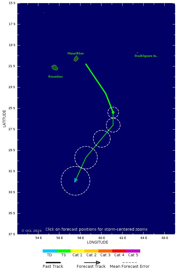 En raison de la proximité de ce système avec les iles des Mascareignes, des conditions météorologiques dégradées à des degrés divers sont attendues dans les prochaines 48h. Des épisodes de fortes pluies et de vents forts sont possibles sur la Réunion et l'île Maurice. L'état de la mer sera également dégradées sur les iles soeurs et Rodrigues.