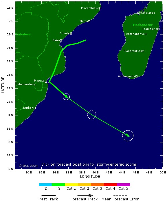 Le centre météorologique du Mozambique a lancé un avis pour les province de Sofala (districts de Machanga, Chibabava, Buzi) et Inhambane (districts de Funhalouro, Mabote, Homoine, Morrumbene, Massinga, Vilankulo, Inhassoro, Govuro, Panda et les villes de Maxixe et Inhambane) pour risque de pluies supérieures à 200mm en 24h et de vents à 120 km/h.