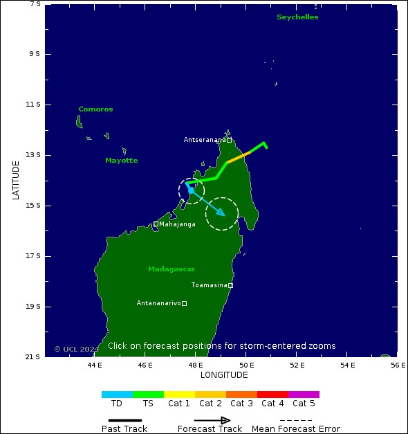 Le centre de la circulation dépressionnaire devrait évoluer sur Masoala et ressortir en mer en fin de semaine. Puis, la trajectoire s'oriente franchement vers l'Est à Sud-Est, ce qui rapprocherait le phénomène du secteur Réunion/Maurice durant le weekend pascal.
