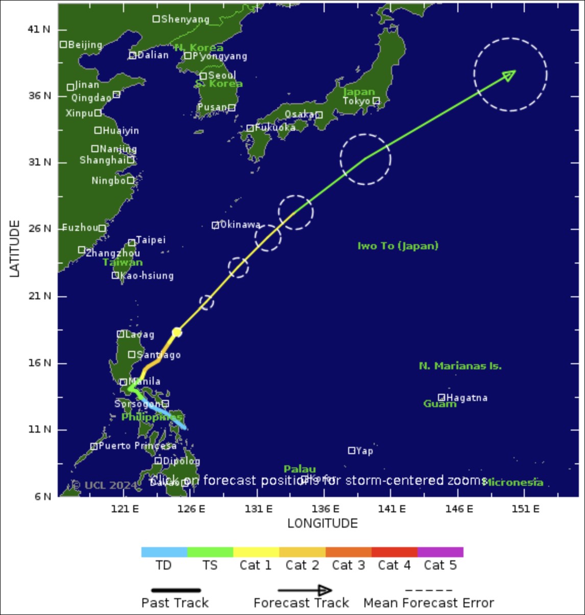 Une fois au-dessus des eaux libres, le système devrait se renforcer en typhon alors qu’il continue de se déplacer vers le nord-est au large de la côte est de Luçon jusqu’au 27 mai. La tempête se renforcera encore jusqu’au 28 mai avant de s’affaiblir à nouveau en tempête tropicale violente alors qu’elle continue de se déplacer vers le nord-est au-dessus du nord-ouest de la mer des Philippines, au sud des îles Ryukyu au Japon et du sud du Japon continental, du 29 au 31 mai. La trajectoire et les prévisions d’intensité de la tempête restent quelque peu incertaines, et des changements pourraient se produire au cours des heures et des jours à venir.