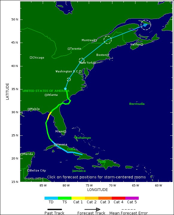 Les vents maximums soutenus sont proches de (75 km/h) avec des rafales plus élevées. Un renforcement est prévu, et Debby devrait devenir un ouragan avant d’atteindre la côte de Big Bend en Floride. Un affaiblissement est attendu lundi et mardi après que Debby se sera installée à l’intérieur des terres.