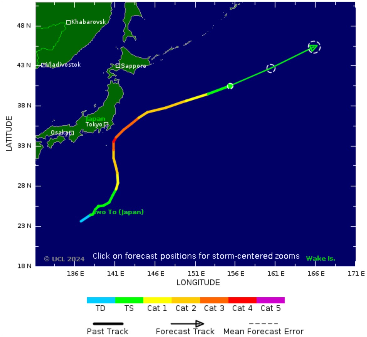 Ampil devrait passer au plus proche de l'est du Japon le 16 août. A cette échéance, le système aura une intensité équivalente à un ouragan de catégorie 3 sur l'échelle de Saffir-Simpson avec des vents atteignant les 160 km/h