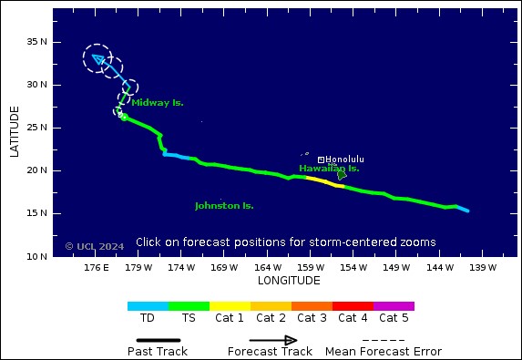La tempête se trouve à environ 958 kilomètres d'Honolulu. Elle a des vents soutenus maximaux de 80 km/h, avec des vents de tempête tropicale s'étendant jusqu'à 185 kilomètres du centre, selon le Centre national des ouragans.