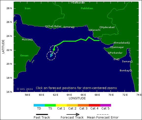 Selon l’avis émis par le Centre d’alerte aux cyclones tropicaux de Karachi, au Pakistan, à 16h26 LT (11h26 UTC), la dépression s’est intensifiée en tempête cyclonique « Asna » et était centrée à environ 170 km au sud-sud-est de Karachi et à 88 km au sud de Kati Bandar. Le système devrait continuer à se déplacer vers l’ouest-nord-ouest.
