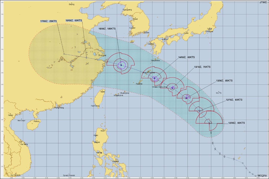 Les modèles de prévision indiquent que le système météorologique se renforcera alors qu’il continuera vers le nord-ouest et s’approchera de Minamidaitojima, au Japon, tôt le 14 septembre, passant juste au nord-est de l’île. Bebinca devrait se diriger vers le nord-ouest et s’approcher à nouveau des îles Amami plus tard dans la journée. Bebinca devrait se renforcer en typhon alors qu’il se dirige vers le nord-ouest à travers la mer de Chine orientale en direction du sud-est de la Chine jusqu’au 15 septembre avant de toucher terre sur la province du Zhejiang au début du 16 septembre. Après avoir touché terre, Bebinca devrait s’affaiblir rapidement en dépression tropicale alors qu’elle se dirige vers l’ouest-nord-ouest à travers la province d’Anhui jusqu’au début du 18 septembre. Une certaine incertitude subsiste dans les prévisions de trajectoire et d’intensité, et des changements pourraient survenir dans les prochains jours.