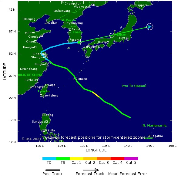20/09 : après avoir touché la région de Shanghaï et perdu de la vigueur, Pulasan va opérer un chnagement de cap radicale et se diriger vers l'Est et se renforcera de nouveau en tempête tropicale. Le système devrait toucher le Sud de la Corée du Sud demain avant de terminer sa route sur l'Est du Japon.