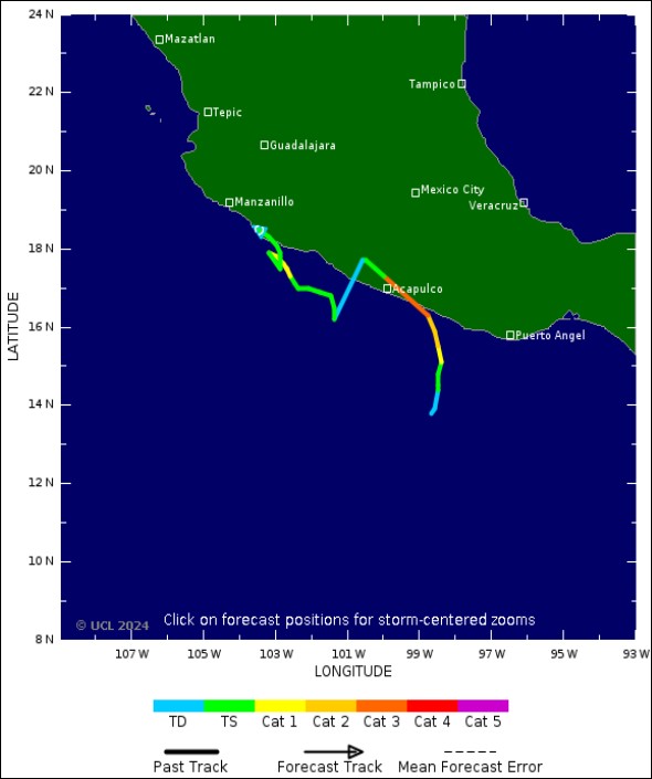 Le système devrait toucher la côte sud du Mexique demain soir avec une intensité d'ouragan de catégorie 2 et des vents à 150 km/h.