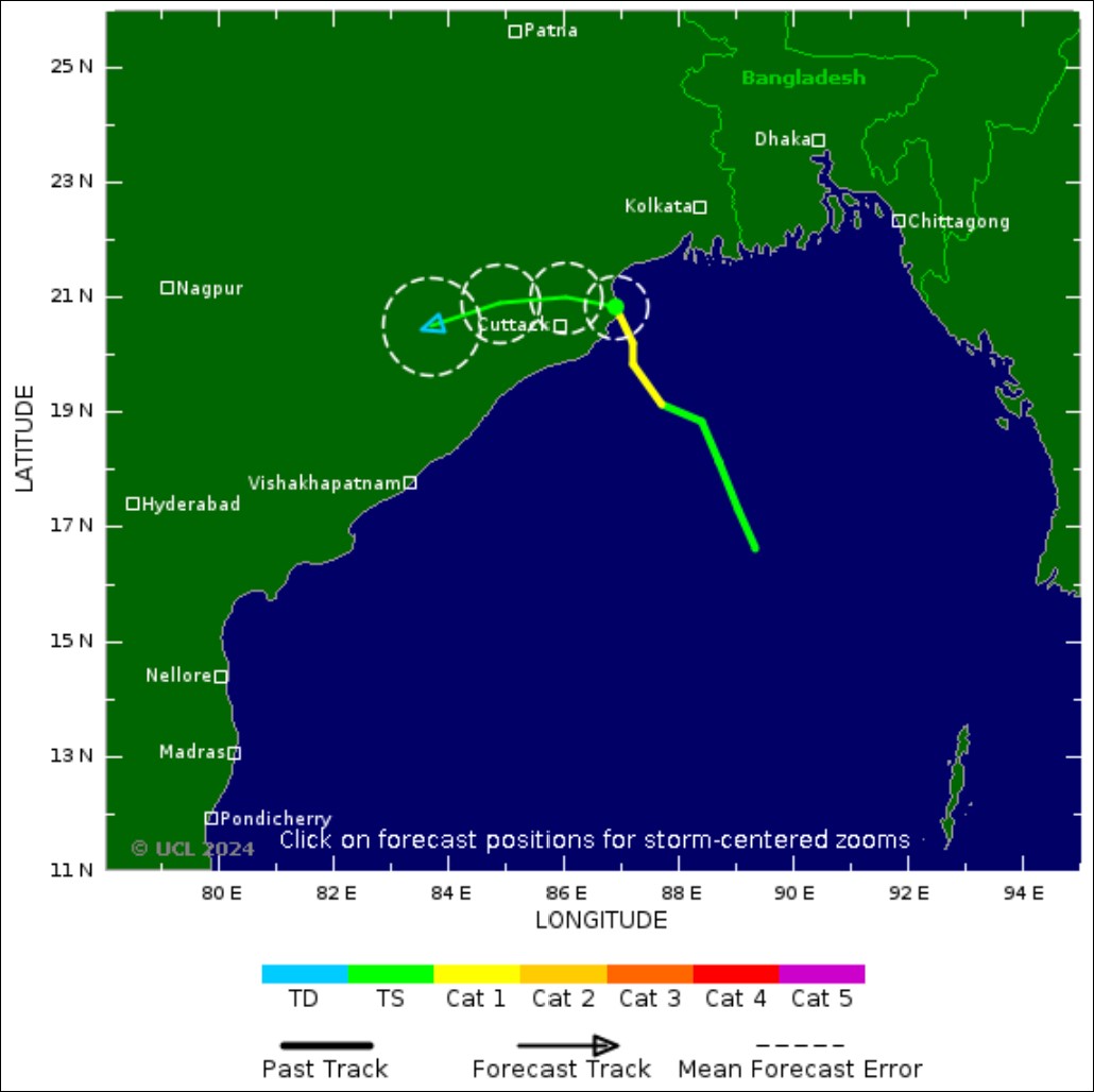 Il devrait traverser le nord de l’Odisha, la côte du Bengale occidental et entre Puri et l’île de Sagar de minuit du 24 octobre jusqu’au matin du 25 octobre en tant que tempête cyclonique sévère, sa vitesse devrait être comprise entre 100 et 110 km/h avec des rafales à 120 km/h, en générant des pluies fortes à extrêmement fortes.