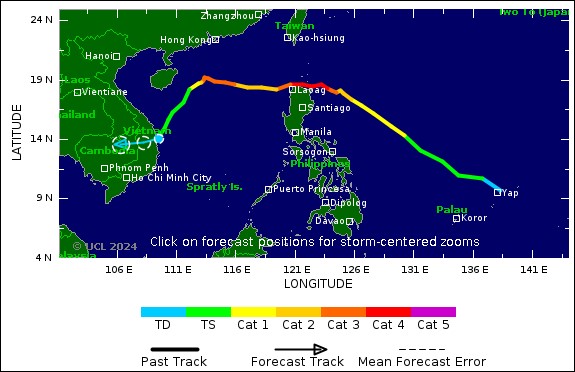 Les modèles de prévision indiquent que le système météorologique s’affaiblira en une dépression tropicale alors qu’il se dirige vers le sud-sud-ouest au-dessus de la mer de Chine méridionale et s’approche de la province de Binh Dinh, au Vietnam, au début du 12 novembre, mais se dissipe juste avant d’atteindre la terre. Une certaine incertitude subsiste dans les prévisions de trajectoire et d’intensité, et des changements pourraient survenir dans les prochains jours.