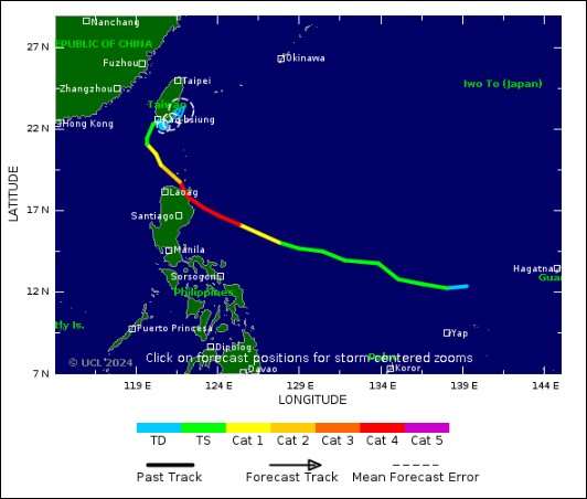 Les modèles de prévision indiquent que le système météorologique se renforcera en typhon au cours des prochaines heures avant de continuer vers le nord-ouest à travers la mer des Philippines jusqu’au 13 novembre et de s’approcher de la province de Cagayan aux Philippines au début du 14 novembre. Usagi devrait toucher terre au-dessus de la province de Batanes, aux Philippines, au début du 15 novembre avant de s’approcher du comté de Pingtung à Taïwan dans l’après-midi du 15 novembre et de se diriger vers le nord parallèlement à la côte jusqu’au début du 16 novembre. La tempête devrait ensuite se diriger vers le nord-est et s’approcher des îles Yaeyama, dans la préfecture d’Okinawa, au Japon, tôt le 17 novembre, en passant juste au sud-est des îles. Une certaine incertitude subsiste dans les prévisions de trajectoire et d’intensité, et des changements pourraient survenir dans les prochains jours.