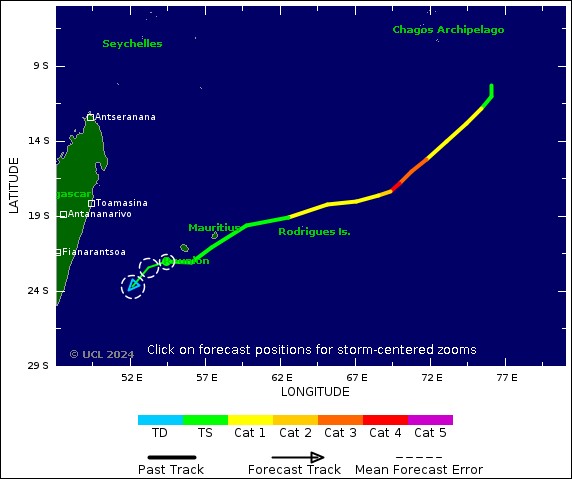 Le passage au plus près de la Réunion pourrait avoir lieu entre mercredi soir et jeudi soir. Si la distance est indéterminée, le transite pourrait se faire au Sud-Est des îles.