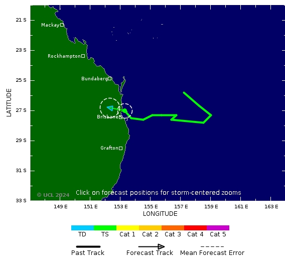 Alfred se trouve actuellement à environ 475 km au nord-est de Brisbane et se dirige vers le sud-est en direction de la côte.