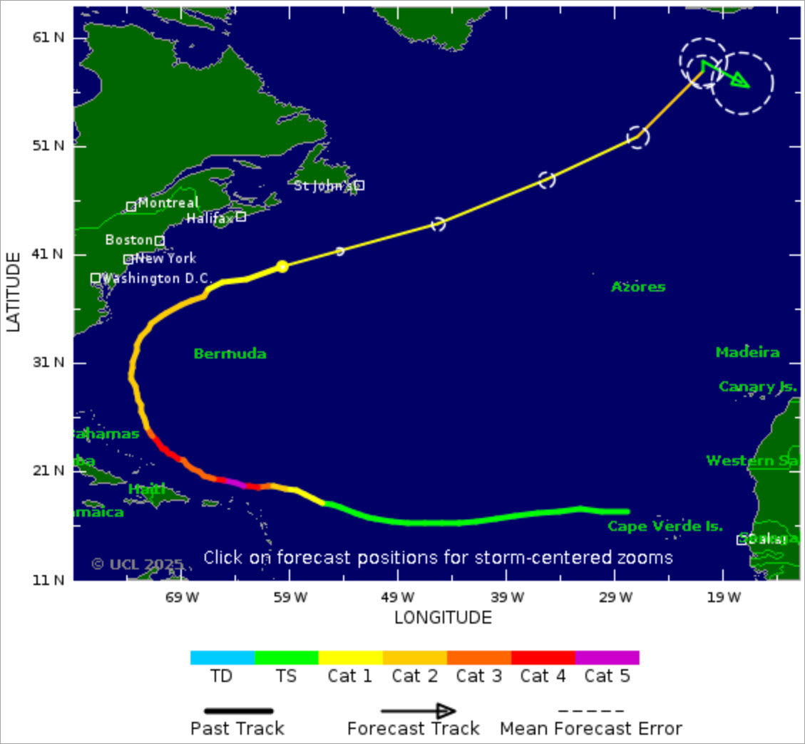 En ce qui concerne la direction probable de la tempête, les modèles s’accordent à dire qu’Erin se dirigera vers le nord ce week-end jusqu’au début de la semaine prochaine, restant bien à l’est des États-Unis.