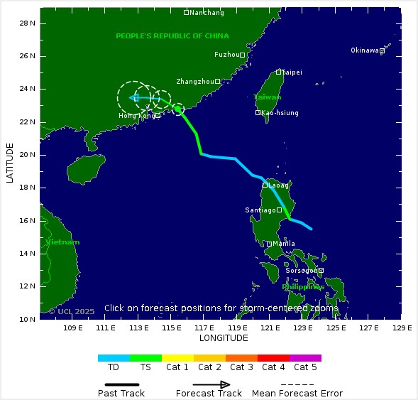 Par la suite, le système devrait retrouver la mer et se diriger vers le Sud de la Chine qu'il devrait atteindre, toujours sous la forme d'une tempête tropicale, le 20/09. Hong-Kong pourrait être particulièrement affecté.