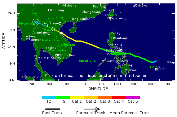 L’Agence météorologique japonaise estime que les vents atteindront 144 km/h jeudi, ce qui pourrait diminuer à environ 126 km/h en entrant dans la mer de l’Est, mais augmenter à nouveau à environ 162 km/h à mesure que la tempête s’approche de la côte centre-nord du Vietnam. L’Observatoire de Hong Kong prévoit une trajectoire similaire, avec une intensité d’environ 130 km/h à l’approche de la côte centrale du Vietnam.
