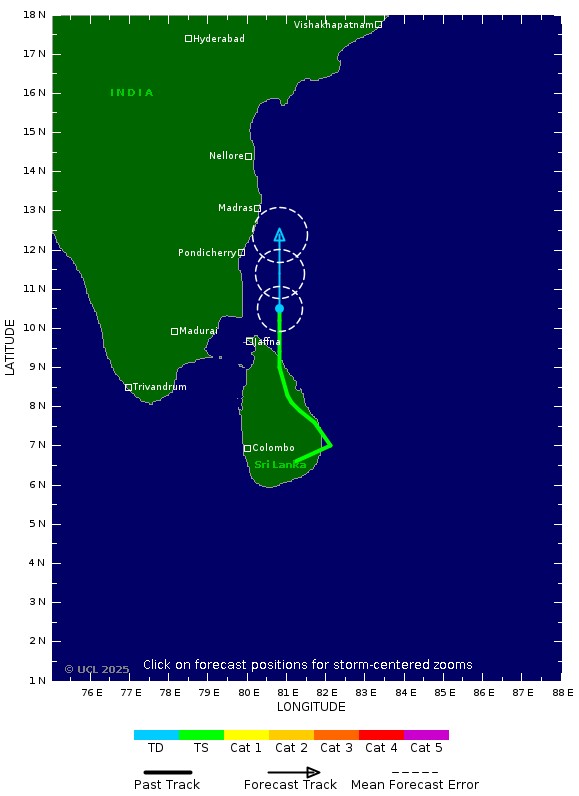 Le système devrait se suivre juste au large de la côte est de l’Inde et passer à l’est de celle-ci Chennai dans environ 36 heures. Concernant l'intensité, Ditwah devrait maintenir son intensité actuelle au cours des prochaines 36 heures cisaillement reste dans la plage de 30–35 km/h .