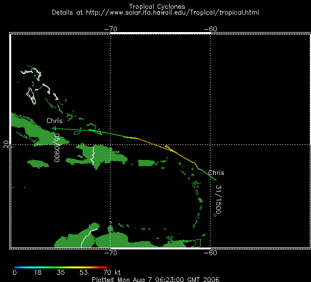 04/08: La tempête tropicale Chris s'est affailblie et est redevenue une dépression tropicale. Vendredi matin, les vents maxima mesurés étaient de 55 Km/h, pression de 1012 hectoPascals. La prévision de trajectoire concerne directement la grande île des Caraïbes, Cuba.