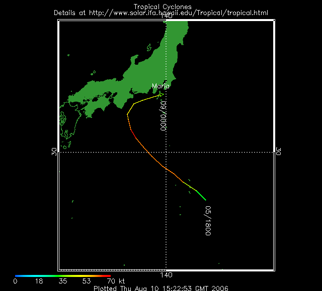 09/08: La tempête Maria à subitement tournée vers lEst juste avant daborder les côtes Japonaises. Elle longe donc le Sud du Japon actuellement avec des vents de 83 km/h en rafale.