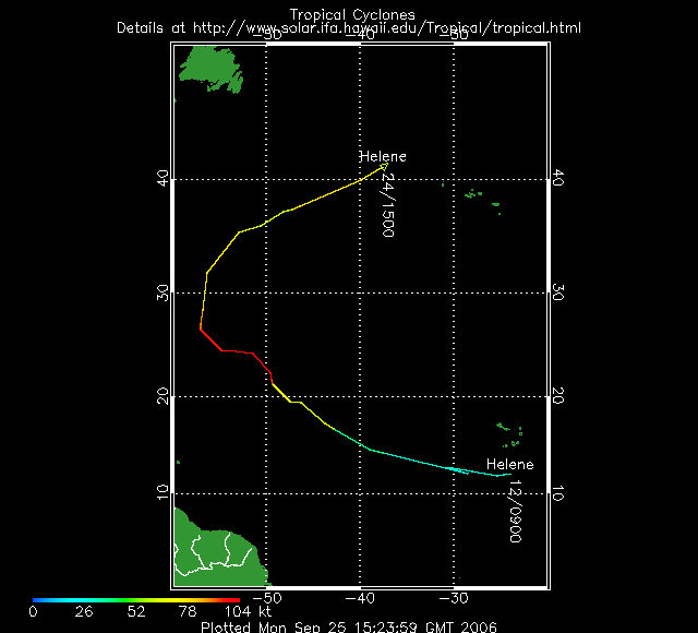 20/09 : Hélène a incurvé sa trajectoire vers le Nord se qui fait que le cyclone devrait éviter l'archipel des Bermudes. Le cyclone devrait perdre de sa vigueur à mesure qu'il remonte vers le Nord.