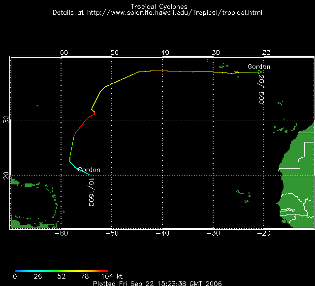 19/09: L'ouragan Gordon se situe dans l'Océan atlantique, à 1.260 kilomètres à l'ouest de Terceira des Açores et devait atteindre les îles portugaises situées au large de l'Afrique de l'ouest mardi après-midi, selon le Centre national des ouragans américain. Les vents de Gordon atteignaient les 160km/h mais devraient ralentir dans les prochaines heures.