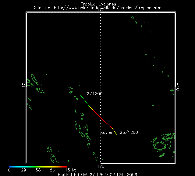 Xavier est accompagné de vents moyens soufflant à 160km/h avec des rafales à 200 km/h. Le cyclone devrait s'atténuer en cyclone de catégorie 3 (sur 5) dans les prochaines heures mais pourrait amener des vents "destructeurs" sur les îles du nord de l'archipel mardi et mercredi, selon le Centre des cyclones tropicaux de Fidji.