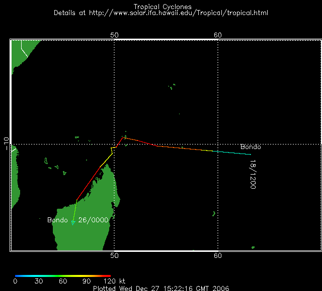 19 et 20/12 : Le cyclone Bondo actuellement situé au large des côtes N-O de Madagascar se dirige vers le Nord de la Grande Ile. Bondo est un cyclone de catégorie 4/5 sur l'échelle de Saffir Simspon et devrait encore se renforcer d'ici demain.