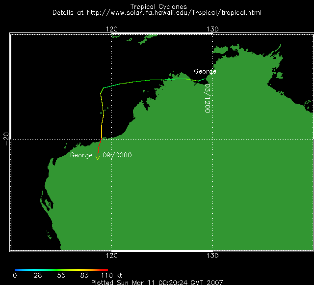 Actuellement Georges se situe à 180 km de Port Hedland et génère des vents moyens à 138 km/h avec des rafales à 166 km/h.