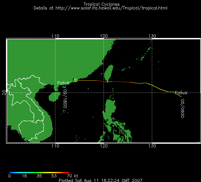 Le système qui génère actuellement des vents moyens de 85km/h se renforce et devrait atteindre le stade cyclonique d'ici à ce soir. A échéance de 36 h, Pbuk devrait encore se renforecer pour atteindre la classe 2 de l'échelle de Saffir-Simpson au moment de son arrivée sur Taïwan.