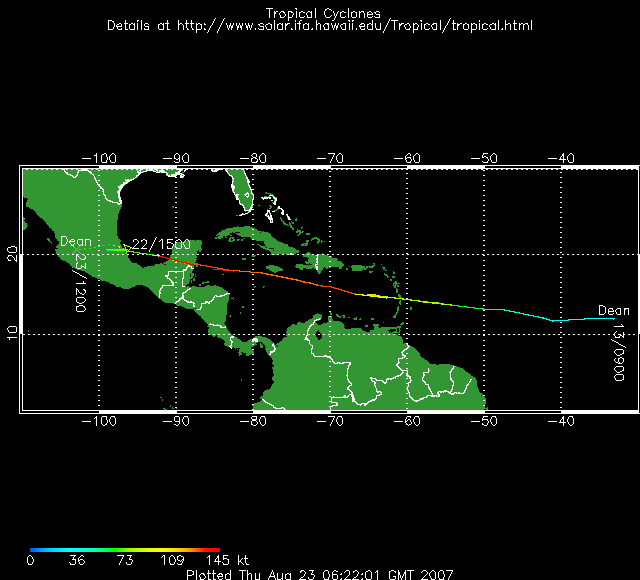 18/08 : L'ouragan Dean, qui a forci dans la nuit avec des vents de près de 145 km/h et qui pourrait être requalifié en catégorie 5, la plus élevée, poursuit sa course en direction de la Jamaïque, indique le Centre américain des ouragans (NHC). Les prévisionnistes estiment que ses vents pourraient alors atteindre les 250 km/h.