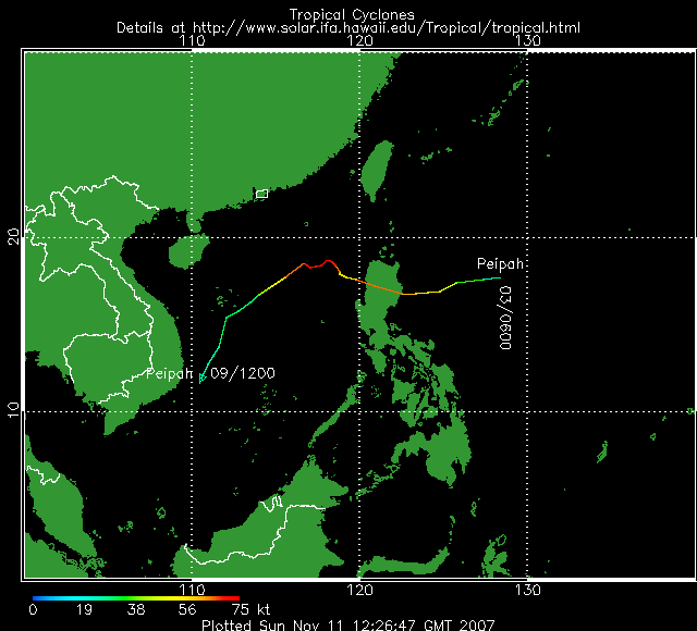 D'après les prévisions, Peipah devrait se renforcer légèrement à mesure de son trajet vers l'Ouest. Actuellement, le système génère des vents moyens de 120 km/h avec des rafales à 148 km/h. Il devrait atteindre les côtes sud Vietnamiennes d'ici 4 jours.